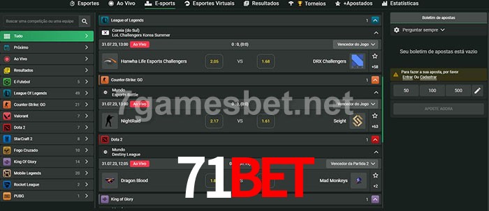 O 71bet oferece uma grande seleção de opções de apostas em e-sports com probabilidades competitivas